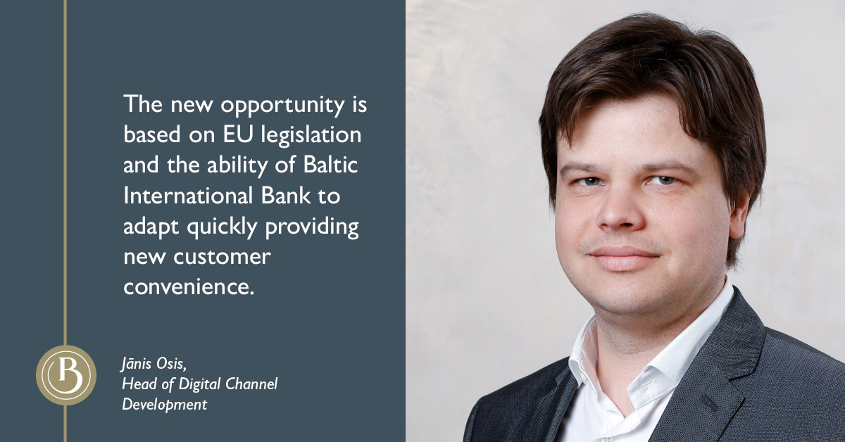 Jānis Osis, head of Digital Channel Development at Baltic International Bank, explains: “The fact that we offer Open Banking means that we are ready to open our payment services to other appropriately certified industry players, and it is up to the Customer to determine whether our bank details will be available to third parties, where and how it will happen.”